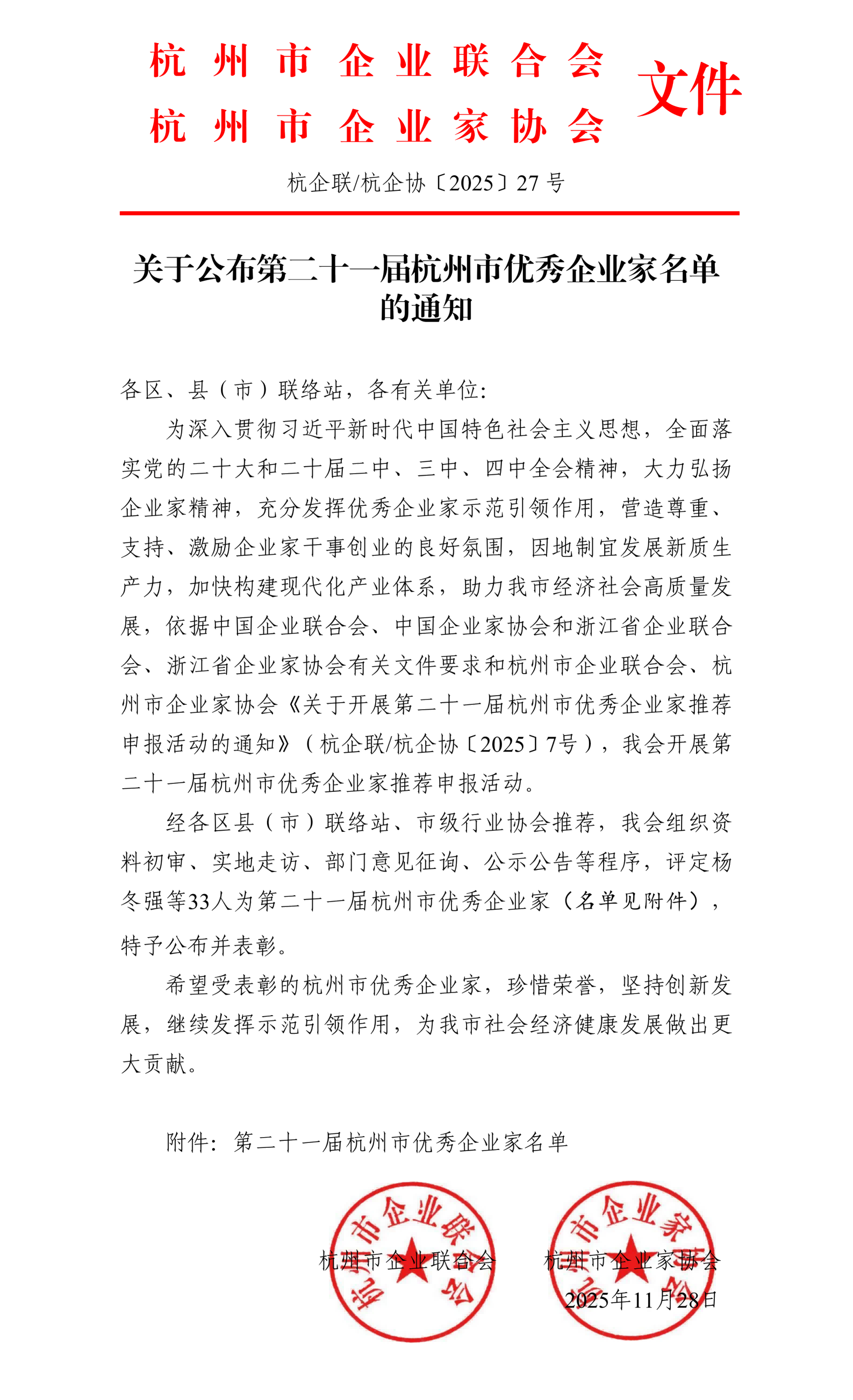 本次評選由杭州市企業(yè)聯(lián)合會、杭州市企業(yè)家協(xié)會組織開展,通過資料初審、實地走訪、部門意見征詢等程序進行綜合考量和推選,旨在大力弘揚企業(yè)家精神,充分發(fā)揮優(yōu)秀企業(yè)家示范引領(lǐng)作用,營造尊重、支持、激勵企業(yè)家干事創(chuàng)業(yè)的良好氛圍,因地制宜發(fā)展新質(zhì)生產(chǎn)力,加快構(gòu)建現(xiàn)代化產(chǎn)業(yè)體系,助力經(jīng)濟社會高質(zhì)量發(fā)展。